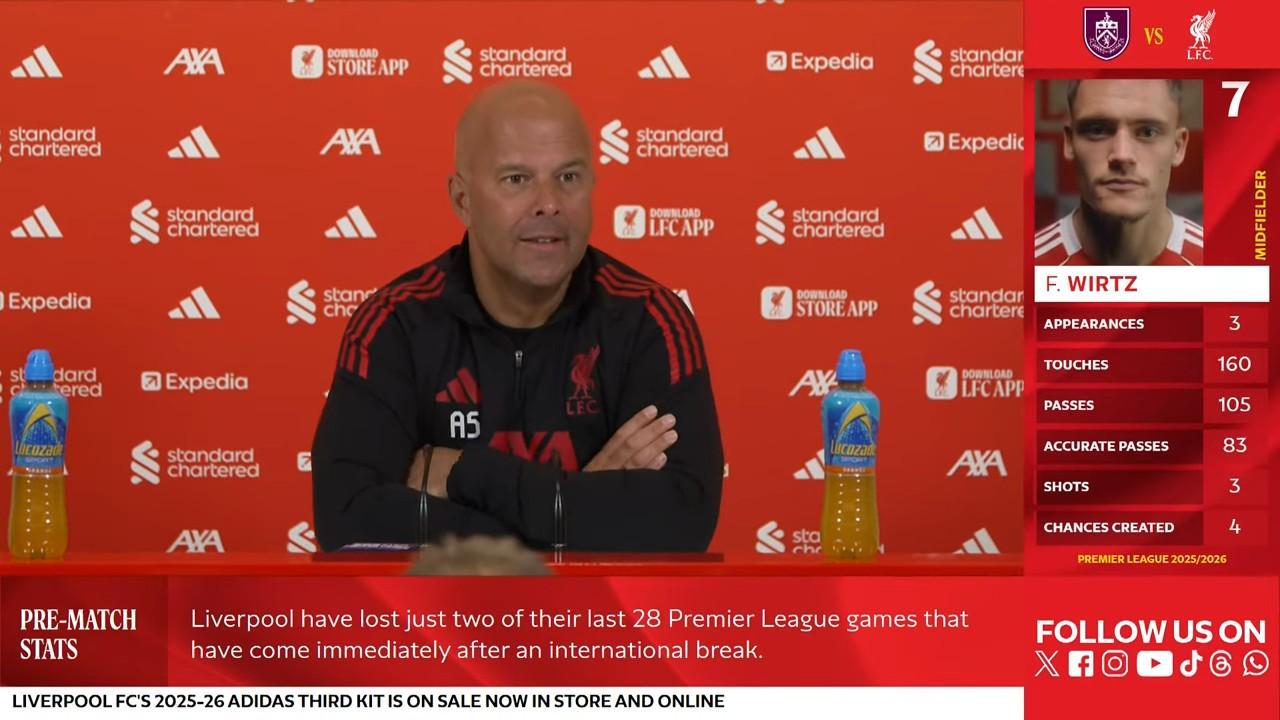 北京时间9月14日,英超第4轮比赛,利物浦将客场对阵伯恩利。利物浦主帅斯洛特出席了赛前新闻发布会。